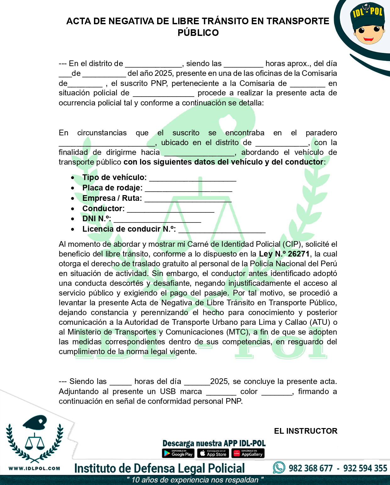 Ya está disponible el modelo del Acta de Negativa de Libre Tránsito en Transporte Público, elaborado para el personal PNP que vea vulnerado su derecho al pase libre establecido en la Ley N.º 26271.