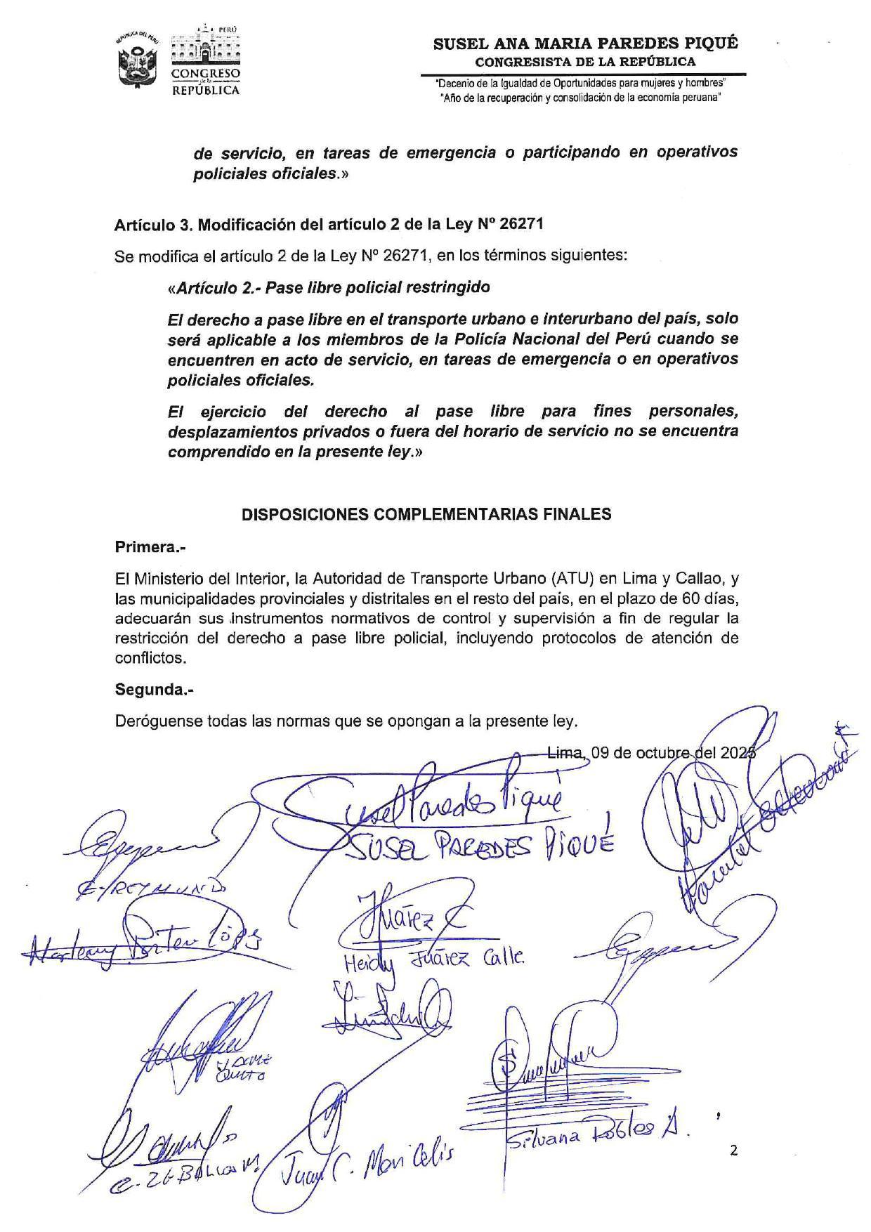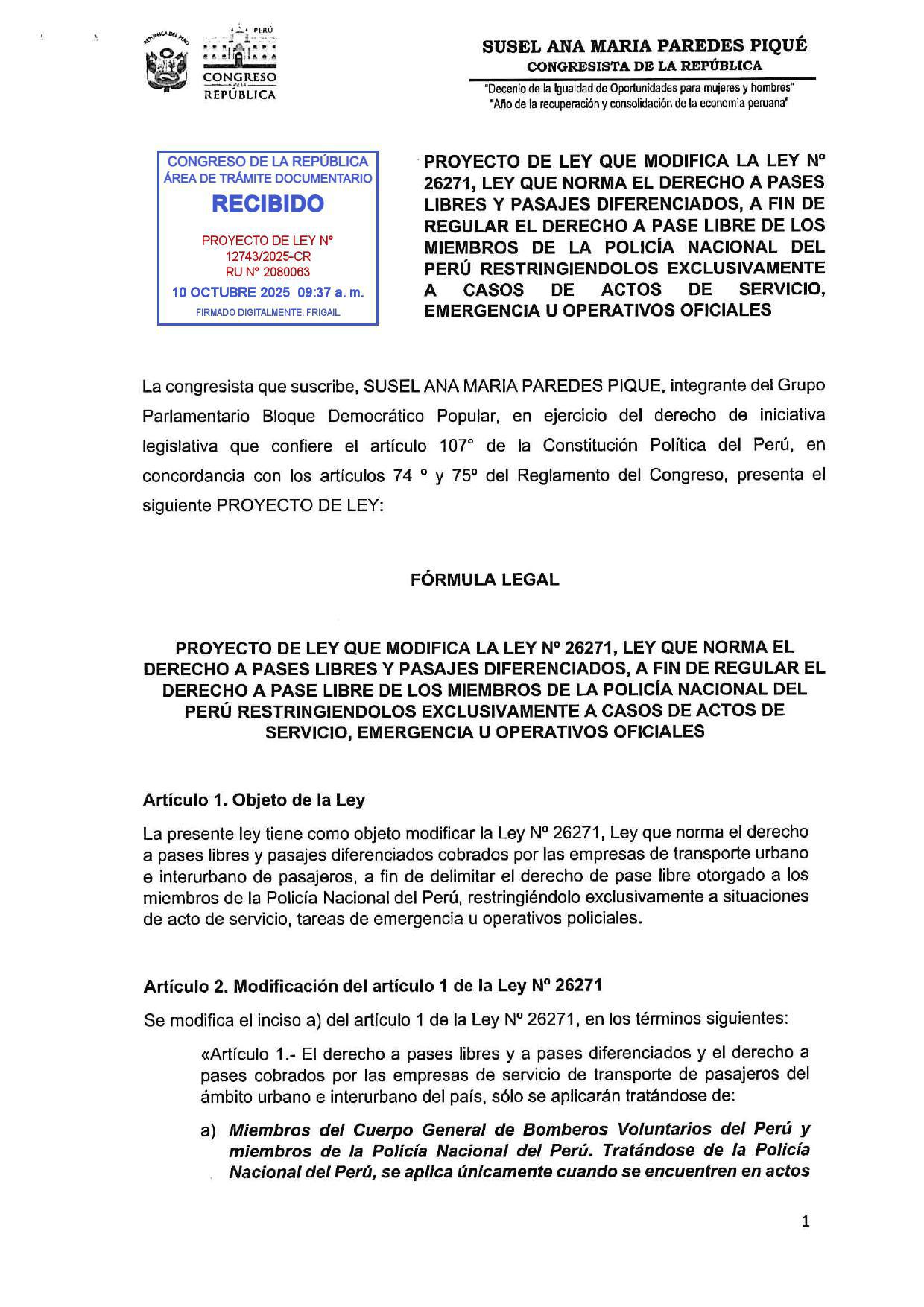 Mediante Proyecto de Ley N.° 12743/2025-CR, la congresista Susel Paredes propone restringir el pase libre policial únicamente a casos de actos de servicio, emergencias o participación en operativos oficiales