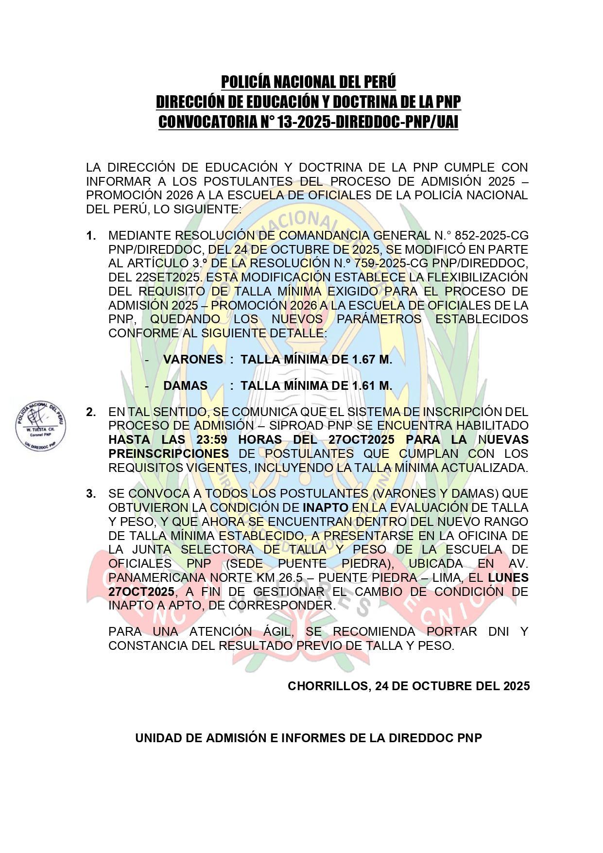 👮♂️Los postulantes declarados inaptos por talla y peso podrán presentarse hasta el 27OCT2025 en la Escuela de Oficiales (Puente Piedra), con su DNI y constancia de resultados, para gestionar el cambio de condición a aptos.