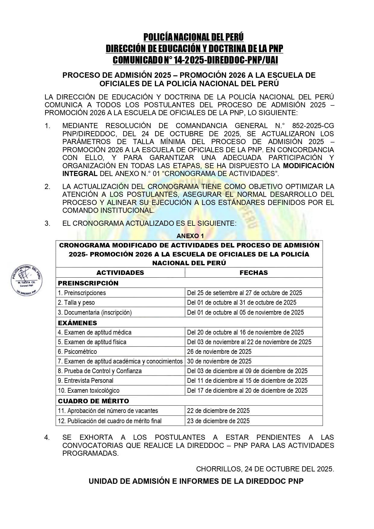 📢Mediante la RCG N.º 852-2025, se informó la modificación del requisito de talla mínima para el proceso de admisión 2025 a la Escuela de Oficiales PNP.