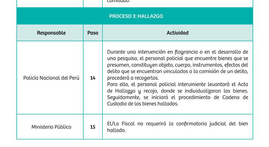 📜En su Proceso 3: Hallazgo (Paso 14), el documento señala que el personal policial interviniente es responsable de recoger los bienes hallados durante una intervención en flagrancia, levantar el Acta de Hallazgo e iniciar la cadena de custodia.