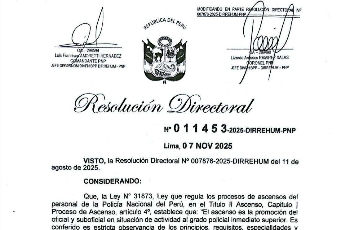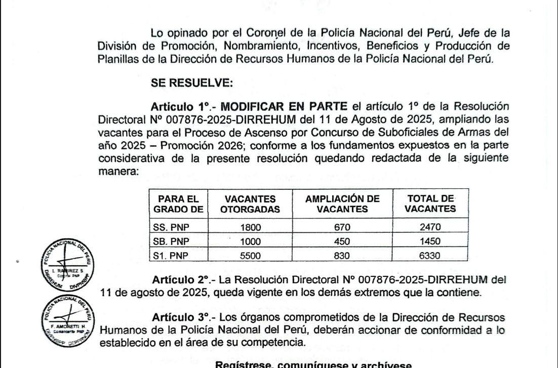 Mediante Resolución Directoral N.° 011453-2025-DIRREHUM-PNP, se amplían las vacantes del Proceso de Ascenso por Concurso de Suboficiales de Armas del año 2025 (Promoción 2026):