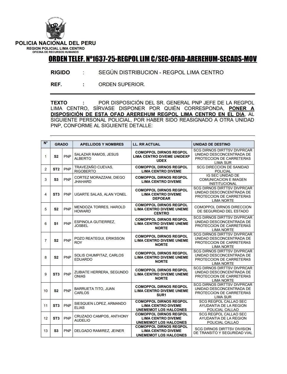 Tras la Disposición de Comando N.° 13016, que ordena ejecutar los cambios “en el día” y al término de la distancia, la Región Policial Lima Centro cumplió lo dispuesto.