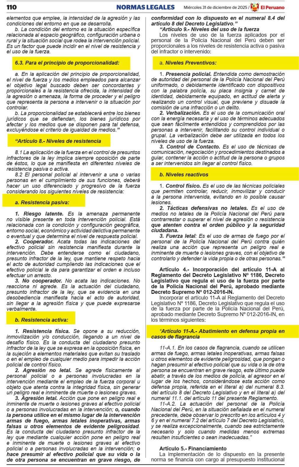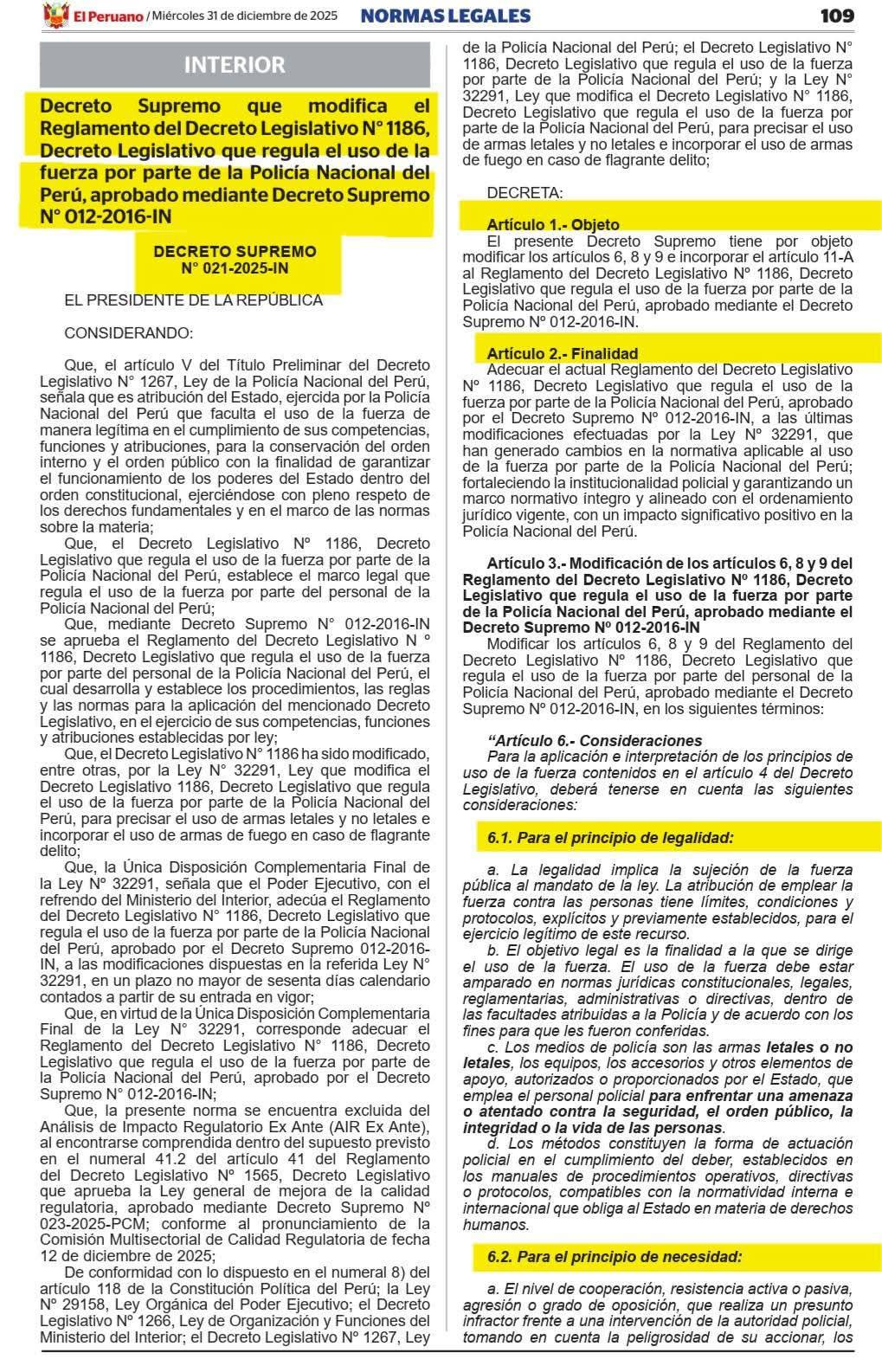 Mediante el D.S. N.° 021-2025-IN, se modificó el Reglamento del D. Leg. 1186 (uso de la fuerza por la PNP), adecuándolo a los cambios de la Ley N.° 32291. La norma actualiza los artículos 6, 8 y 9 e incorpora el artículo 11-A.