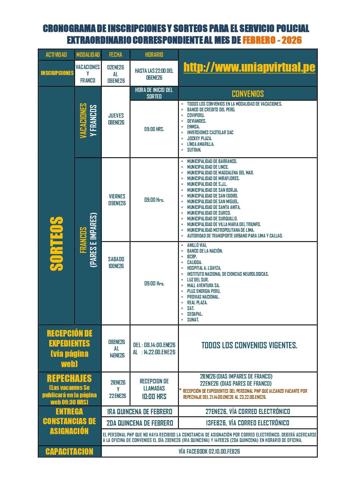 La Policía Nacional del Perú, en colaboración con diversas entidades públicas y privadas, anuncia la convocatoria para el Servicio Policial por Convenio durante el mes de FEBRERO 2026.