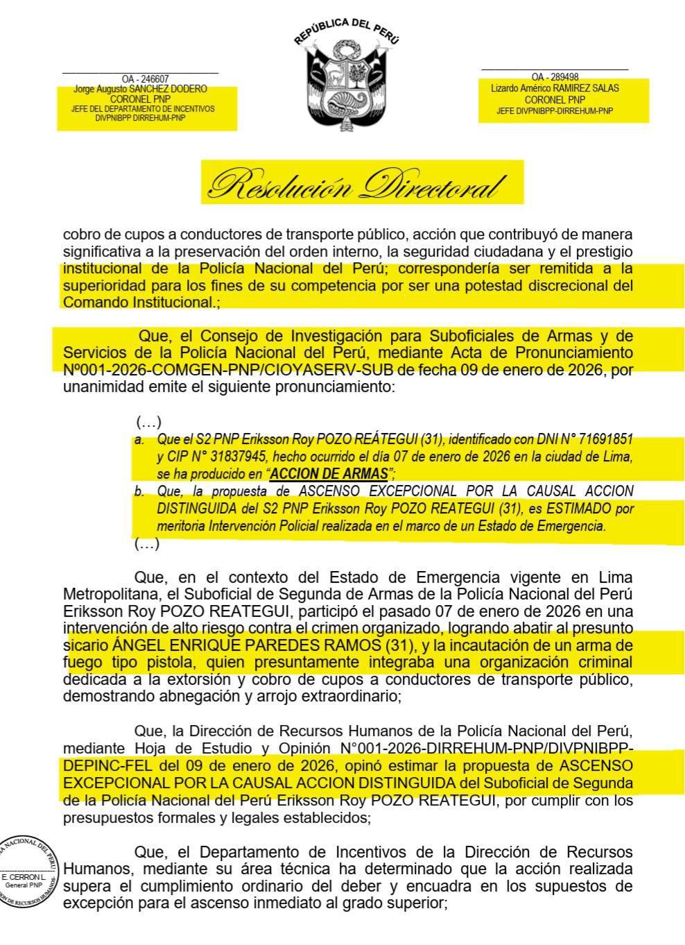 Mediante la Resolución Directoral N.° 00074-2026-, se sustenta el ascenso excepcional por causal de “acción distinguida” a favor del S2 PNP Eriksson Roy Pozo Reátegui, reconociendo una intervención de alto riesgo en el marco del estado de emergencia. ✍️