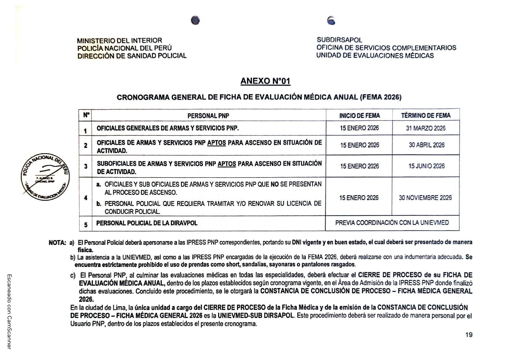 - Personal PNP que NO se presenta al proceso de ascenso y/o personal que tramita o renueva licencia de conducir policial: del 15ENE2026 al 30NOV2026.