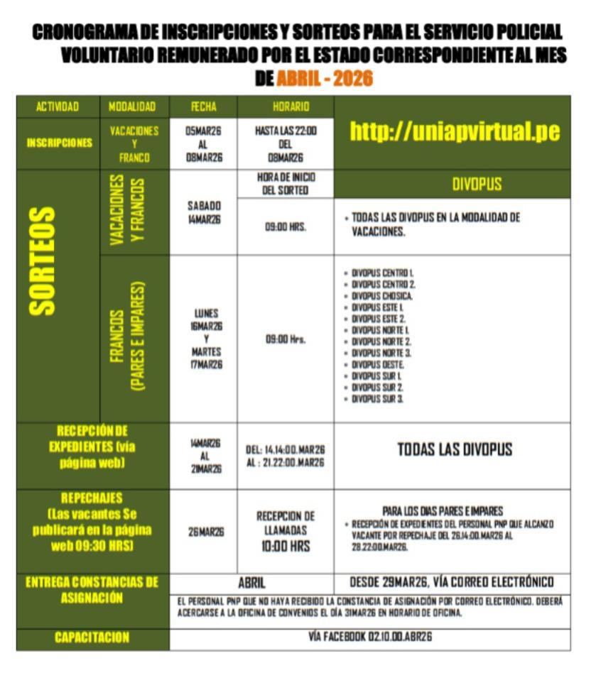 La PNP, en colaboración con diversas entidades públicas y privadas, anuncia la convocatoria para el Servicio Policial por Convenio; asimismo, para el Servicio Policial Remunerado por el Estado (“Plan Celador”), correspondiente al mes de abril de 2026.