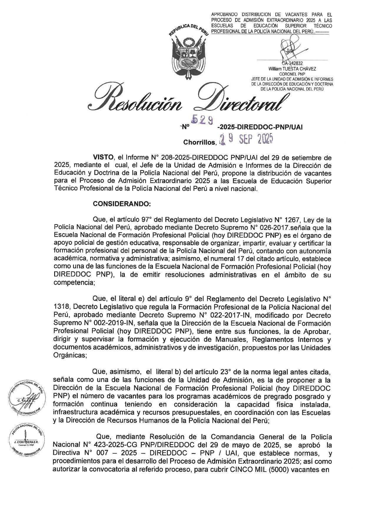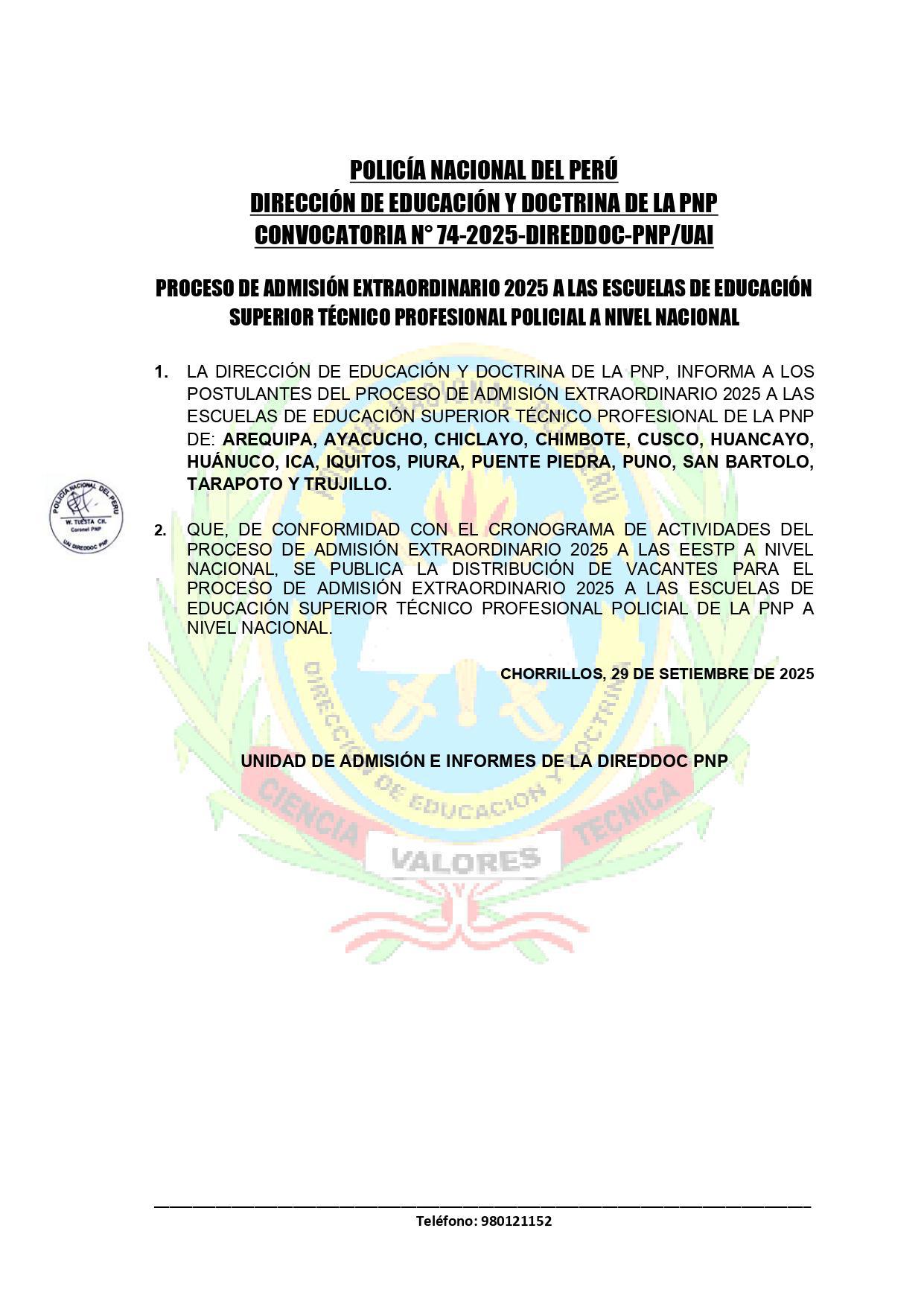 Se publicó el cuadro de mérito final del Proceso de Admisión 2025 a las EESTP PNP a nivel nacional. De acuerdo con los resultados, los ingresantes serán asignados según su promedio final a Lima y a las diferentes sedes en provincias.