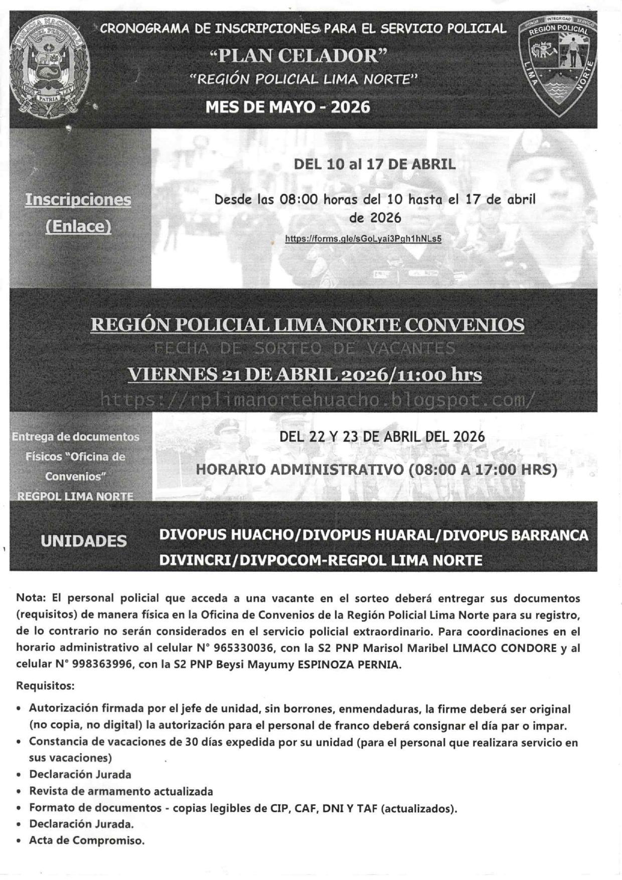 La Región Policial Lima Sur publicó el cronograma de MAYO 2026 del Servicio Policial Remunerado por el Estado – “Plan Celador”.