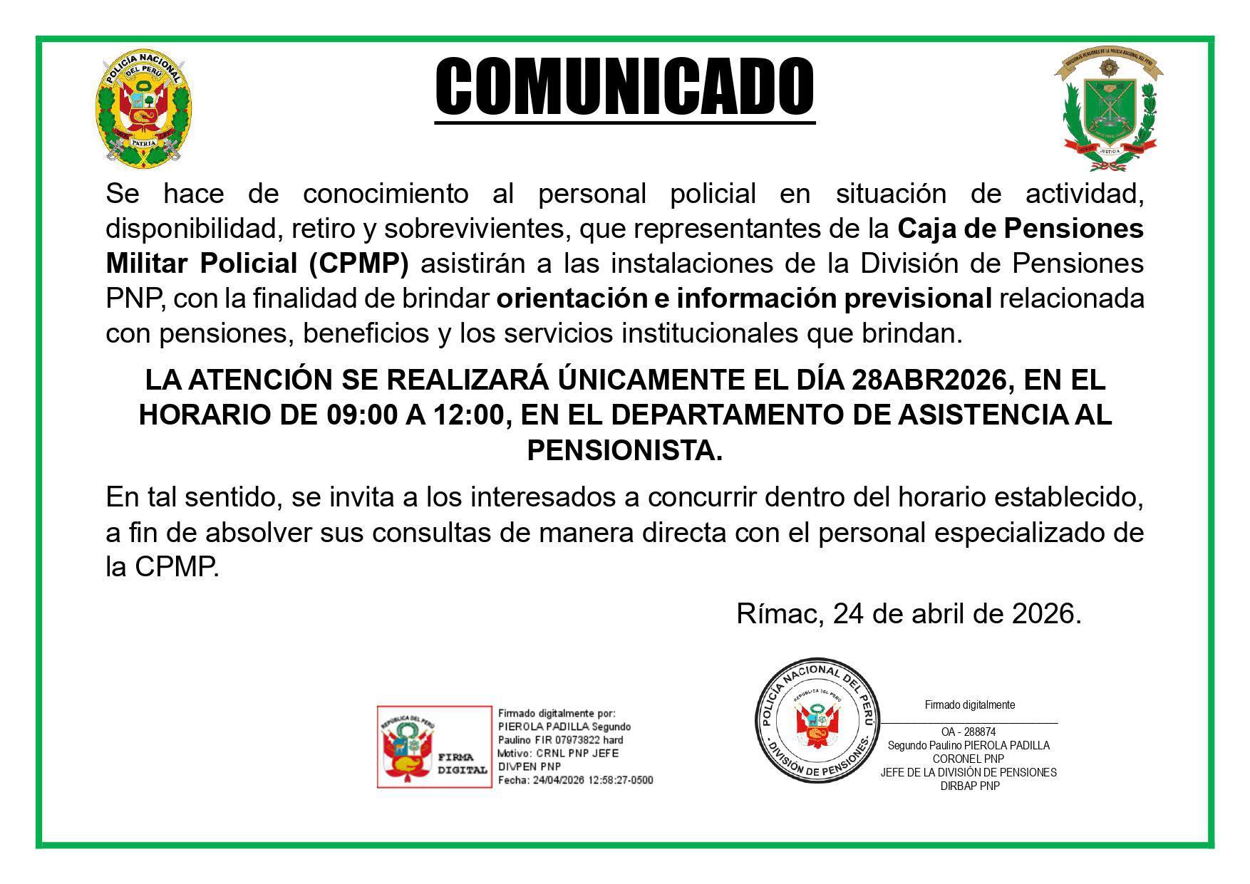 Mediante comunicado, se informó al personal policial en actividad, disponibilidad, retiro y sobrevivientes que representantes de la Caja de Pensiones Militar Policial acudirán a las instalaciones de la División de Pensiones PNP para brindar orientación e información previsional sobre pensiones, beneficios y servicios institucionales.